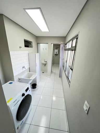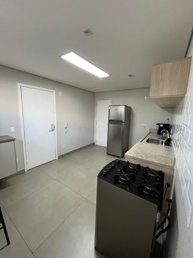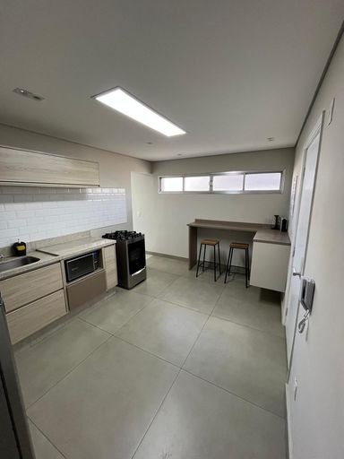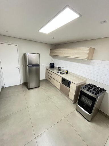 A cozinha é completa, com geladeira, fogão, micro-ondas e filtro de água. A área de serviço ampla possui máquina de lavar e secar. Além disso, há banheiro de serviço e quarto de empregada. O apartamento inclui 1 vaga de garagem.